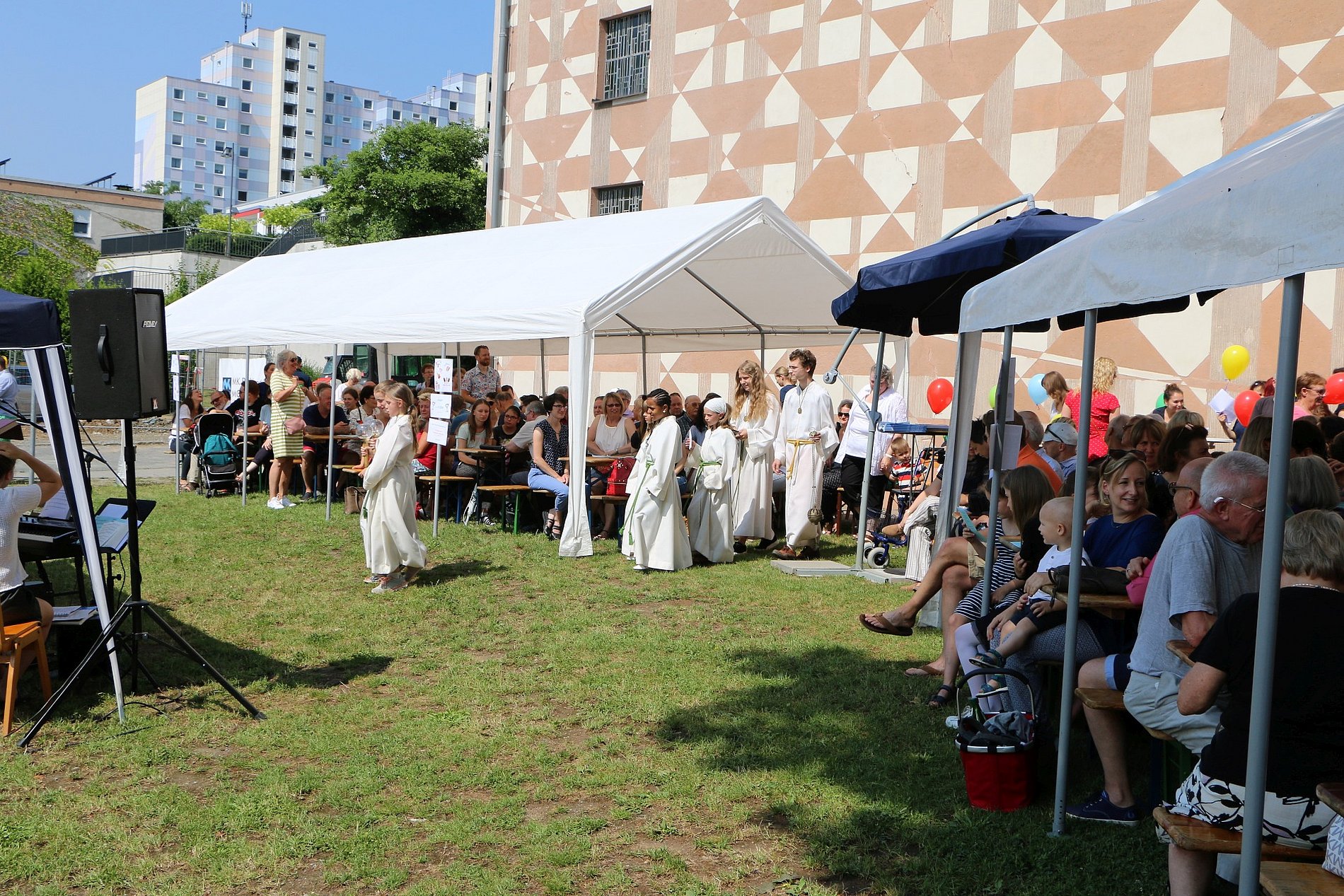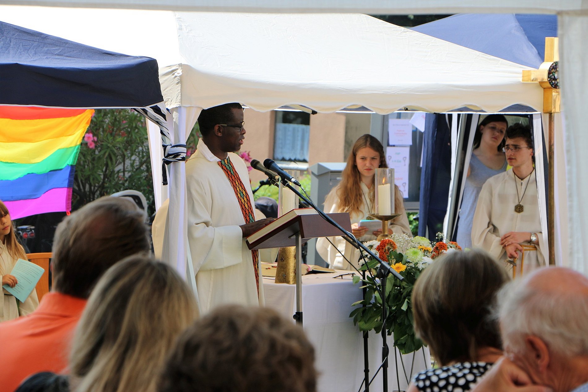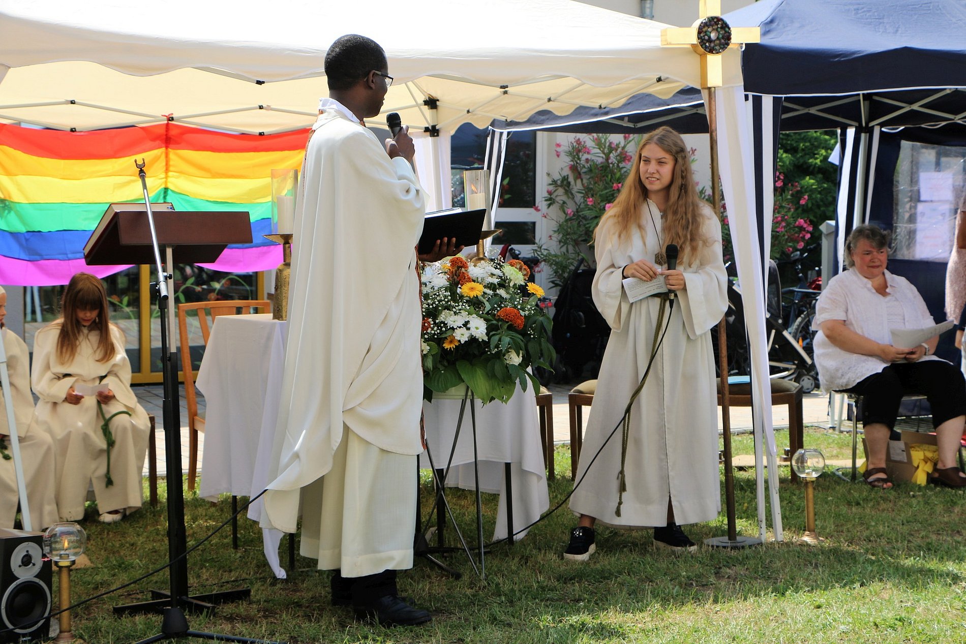 Schon während des Open-Air-Gottesdienst mit Pfarrer Patrick Irankunda unter Mitwirkung der Kindergartenkinder ist keine Wolke mehr zu sehen. In dem farbenfrohen und lebendigen Gottesdienst wurden dann auch unsere drei neuen Ministrantinnen feierlich in ihr neues Amt eingeführt.