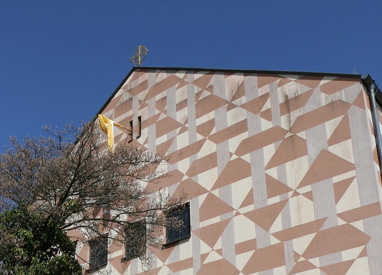 Auf den ersten Blick mutet dem Betrachter die Maria Rosenkranz Kirche im ländlich geprägten Stadtteil Seckbach an, wie eine Scheune. Seit ihrem Bau in den 50er Jahren muss die Gemeinde ohne einen Glockenturm auskommen, von außen gut sichtbar wird ihre Kirche lediglich durch den Scraffito-Putz an zwei Gebäudeseiten.
