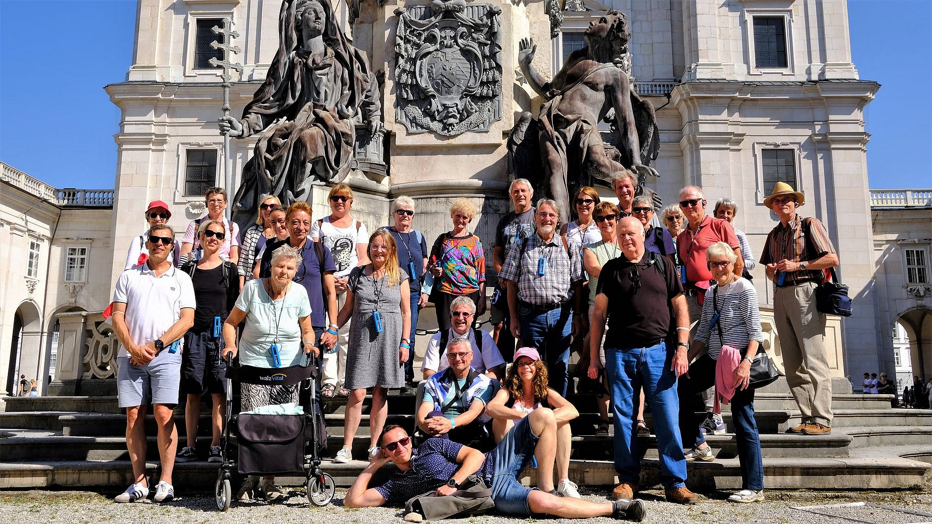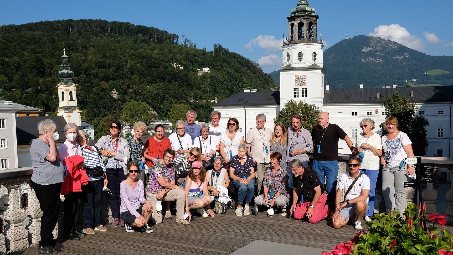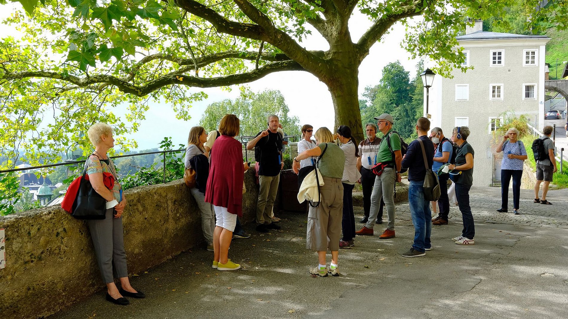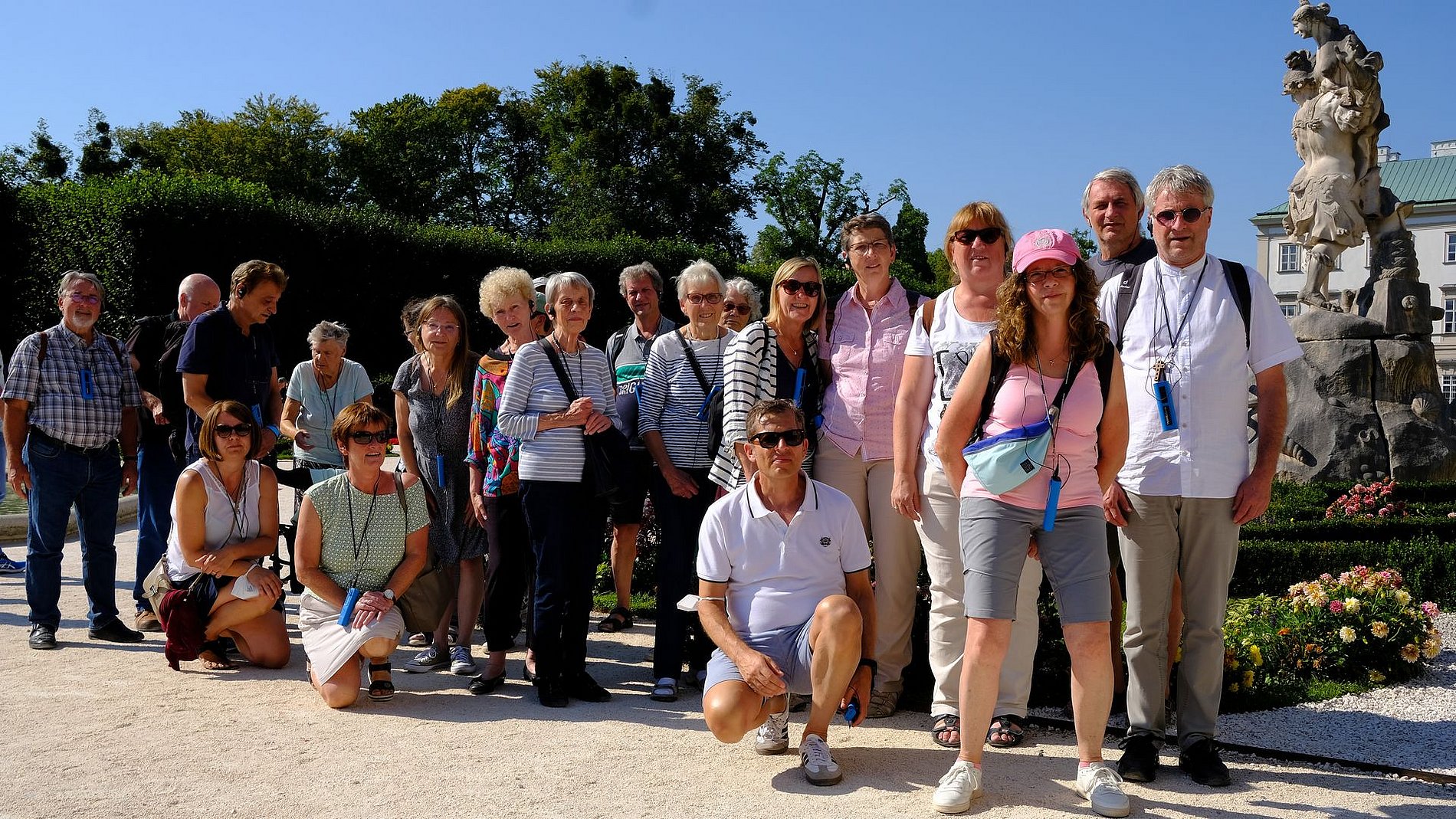 In einer kleinen Wanderung spazierte die Gruppe am Donnerstagmorgen vom Johannessschlössl über den Mönchsberg zur Festung Hohensalzburg, wo ein wunderbarer Blick hinunter zur Stadt und in die Gebirgswelt die Teilnehmer begeisterte. Nachmittags ging es dann auf die andere Seite der Salzach. Auf dem Programm standen das Schloss Mirabell und sein herrlicher Garten. Dem schloss sich ein Spaziergang durch die sogenannte Neustadt und zum St. Sebastiansfriedhof an.