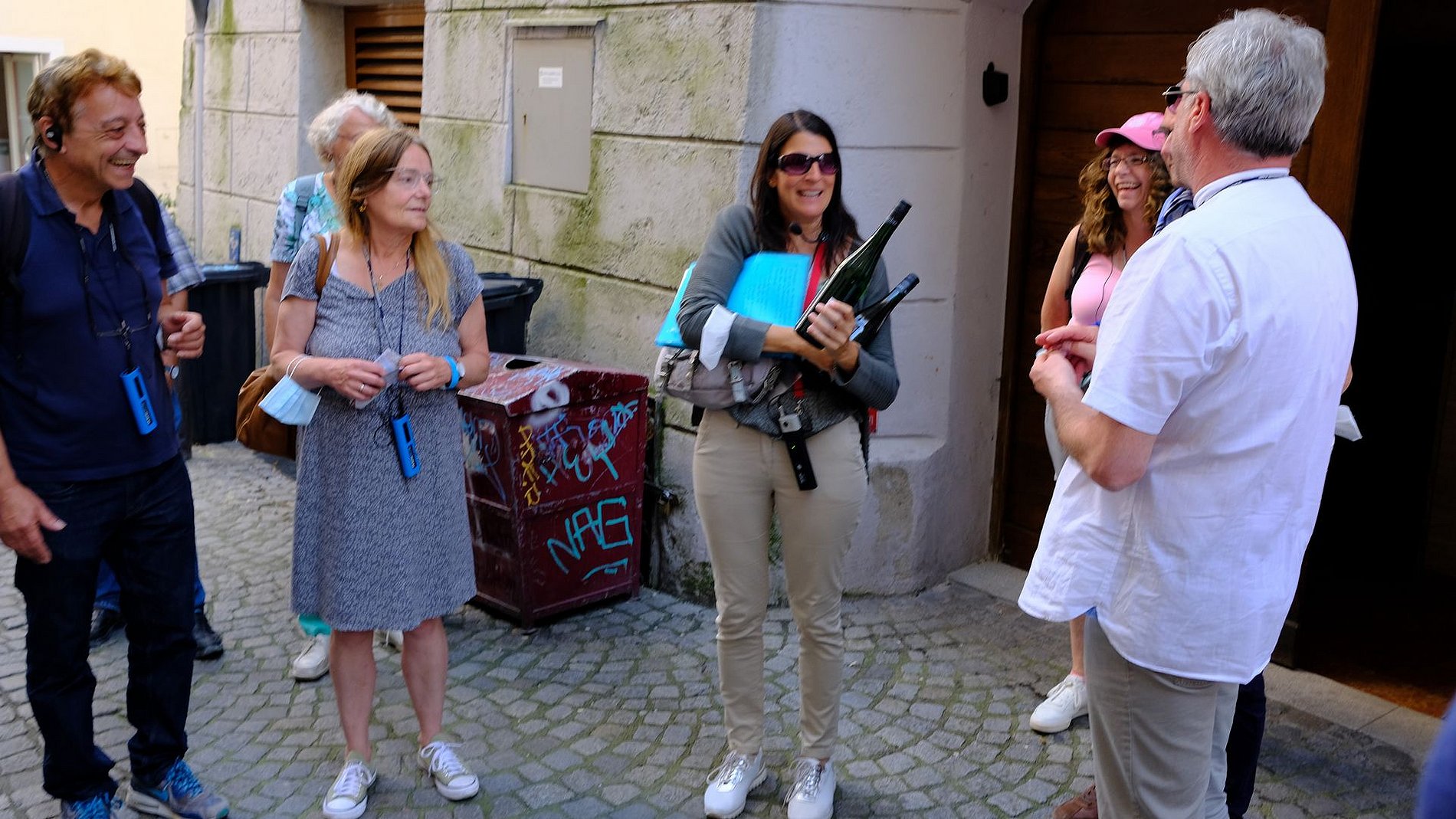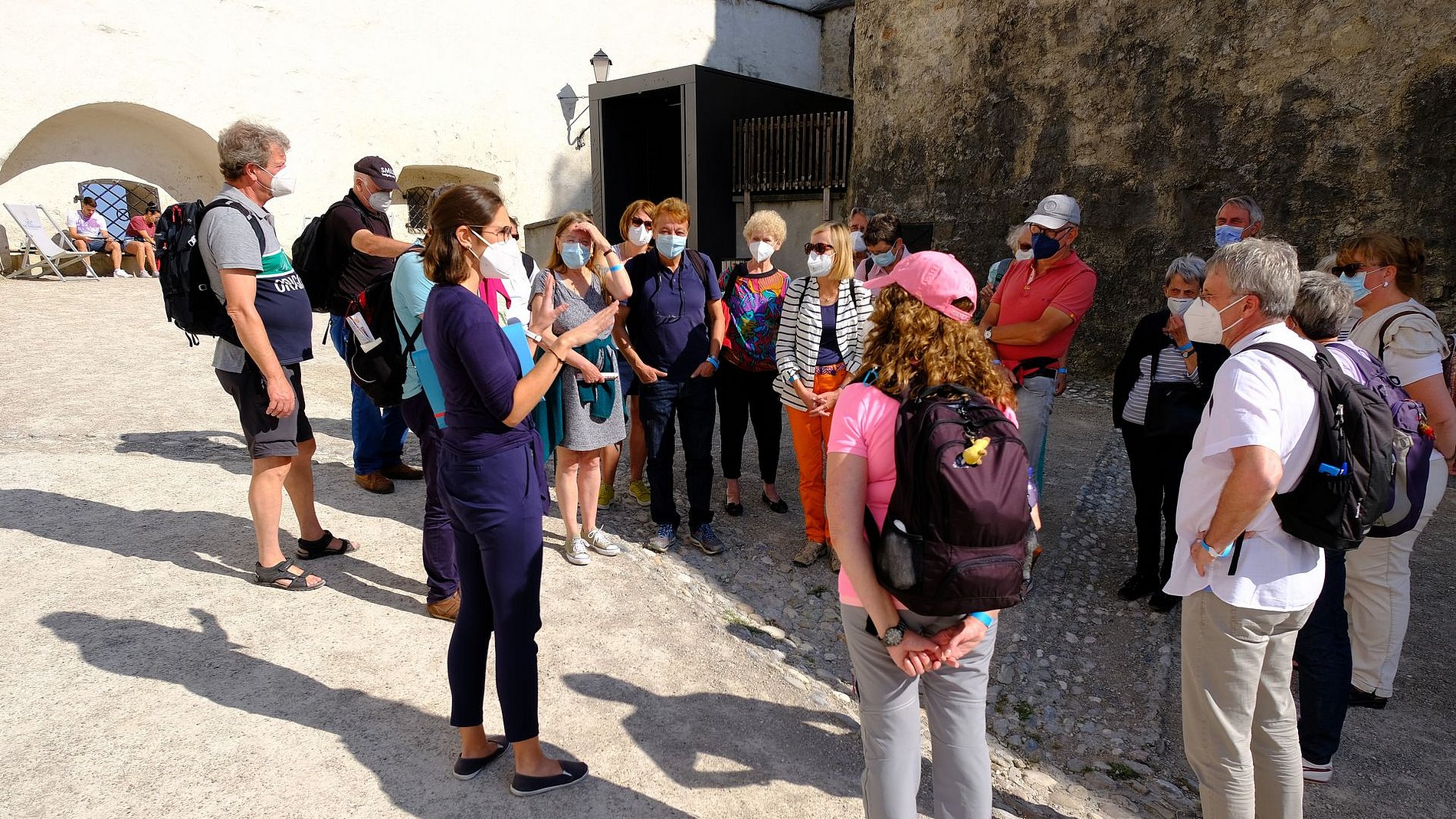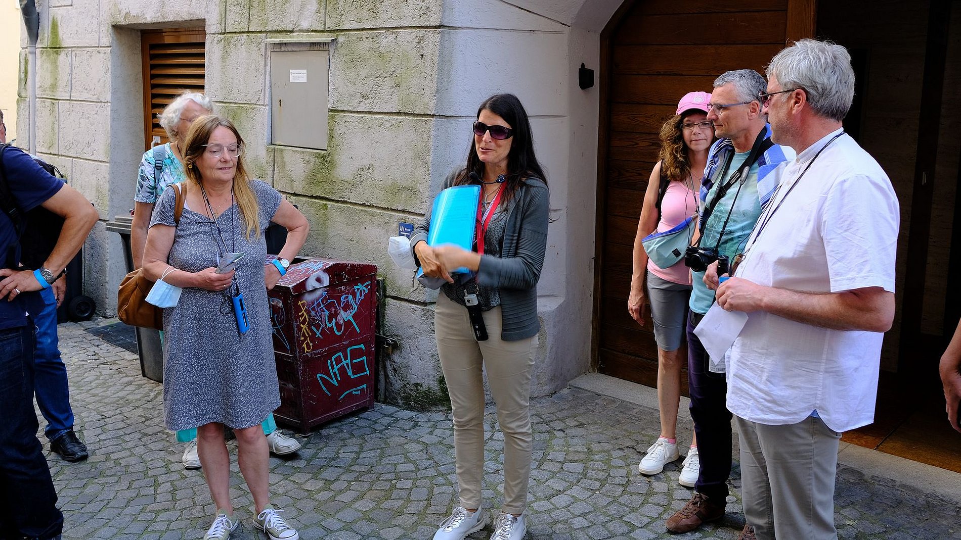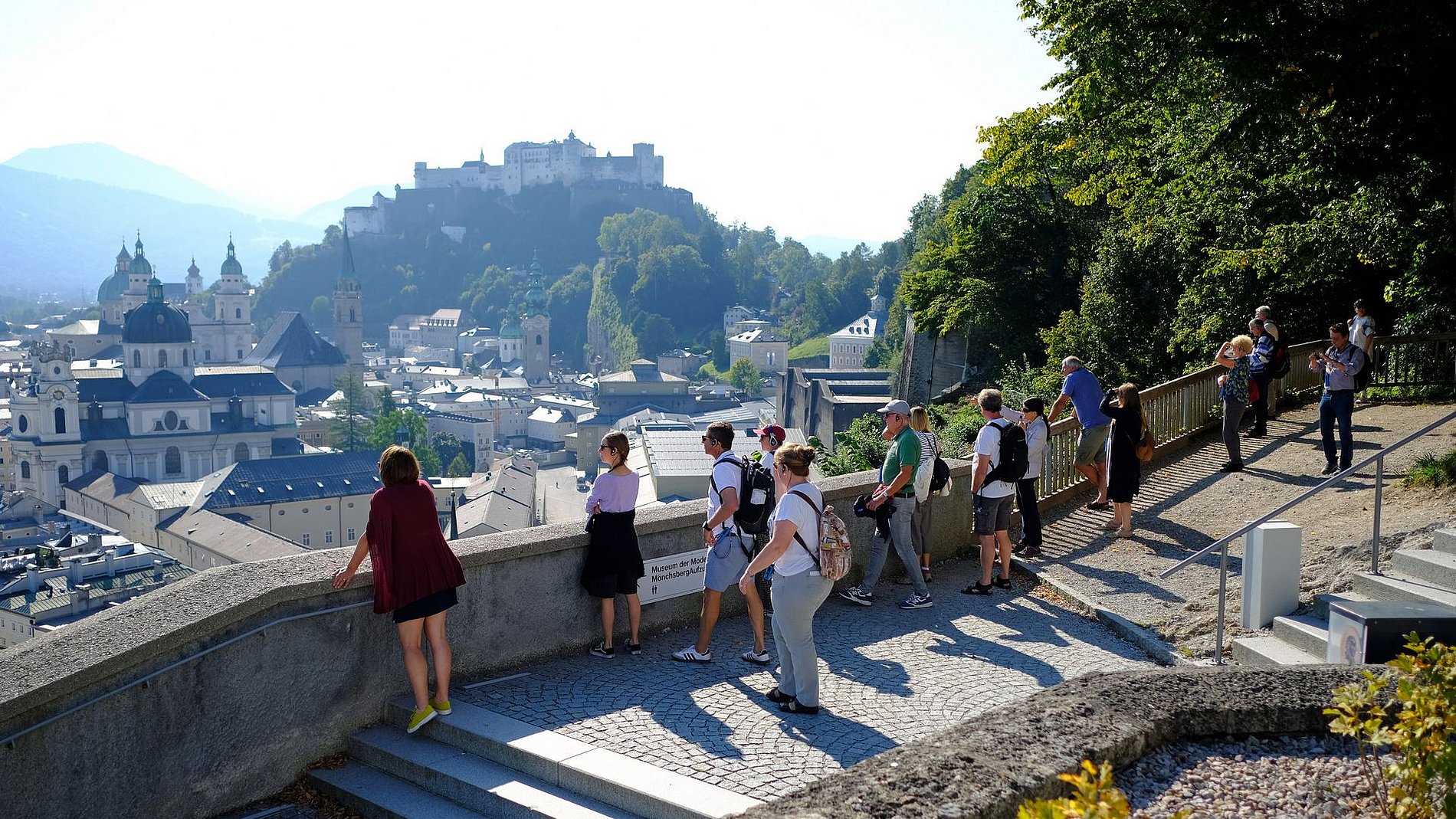 In einer kleinen Wanderung spazierte die Gruppe am Donnerstagmorgen vom Johannessschlössl über den Mönchsberg zur Festung Hohensalzburg, wo ein wunderbarer Blick hinunter zur Stadt und in die Gebirgswelt die Teilnehmer begeisterte. Nachmittags ging es dann auf die andere Seite der Salzach. Auf dem Programm standen das Schloss Mirabell und sein herrlicher Garten. Dem schloss sich ein Spaziergang durch die sogenannte Neustadt und zum St. Sebastiansfriedhof an.