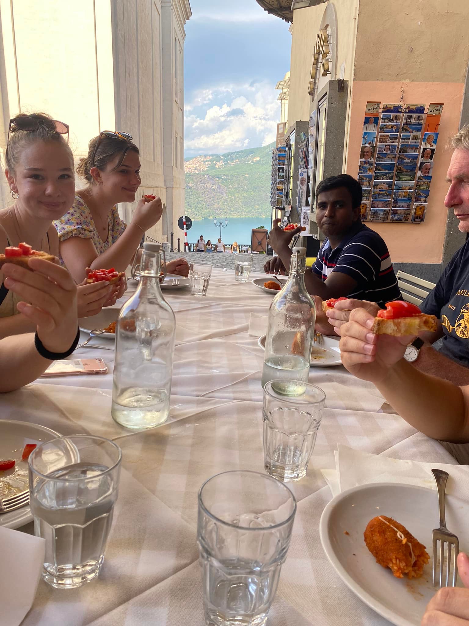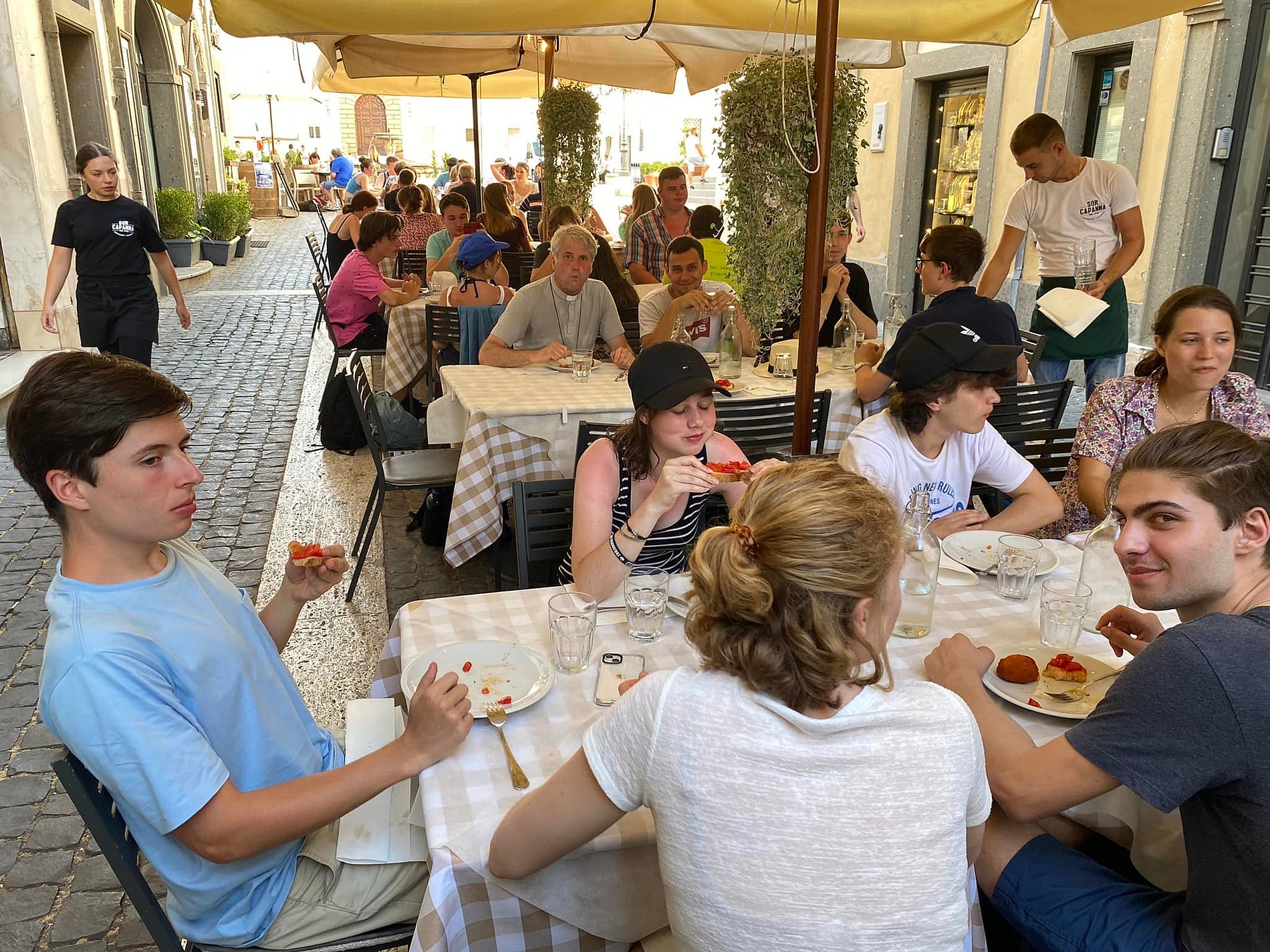Der Dienstag führte uns nach Castel Gandolfo mit den Gärten, dem Papstpalast und dem Lago Albano! Auf Kultur und Entspannung folgte der Höhepunkt des Tages. Eine Ministrantin, die bei der Firmfeier im Mai krank war, konnte Einmaliges erleben. Sie wurde von Pfarrer Schmidt in der Papstkirche in Castel Gandolfo gefirmt. Das Abendessen gab es dann mitten auf der Straße, an für uns gedeckten Tischen teilweise mit Blick auf den See.