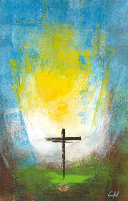 Sie werden dieses Jahr ein Osterbild bekommen, in dem die Farben Blau und Gelb eine entscheidende Rolle spielen – und ebenso das aus ihrer Mischung resultierende Grün. Grün ist die Farbe des Lebens, und doch trägt auch dieses Bild ein JA zum Kreuz in sich. Denn das dunkle Kreuz im unteren Bilddrittel wächst aus einem Grün hervor, das offenbar symbolisch für die Lebensmacht steht, die den Tod überwindet. Nicht aus eigener Kraft allein, sondern weil es tief verwurzelt ist in diesem Grün des Lebens.