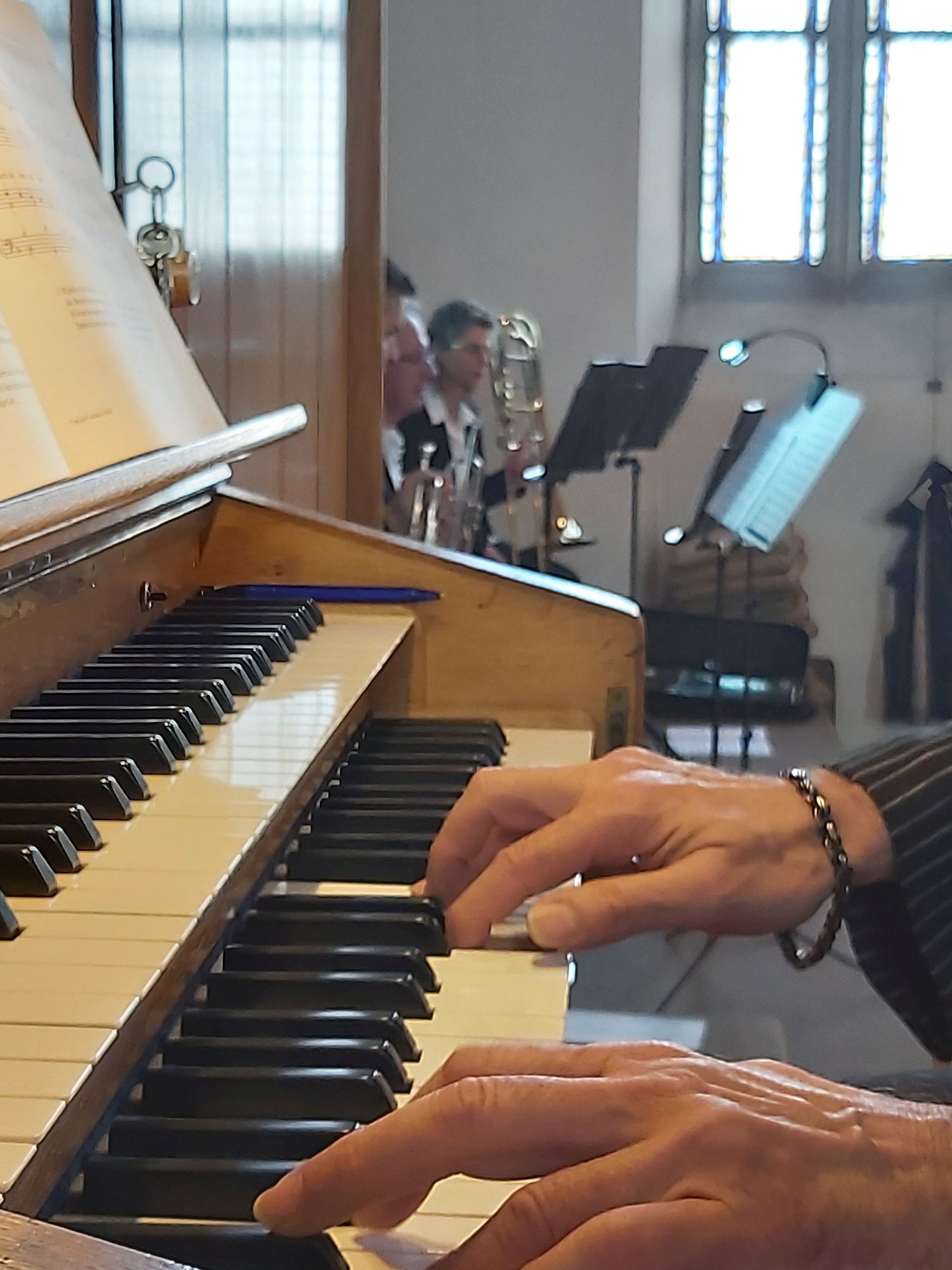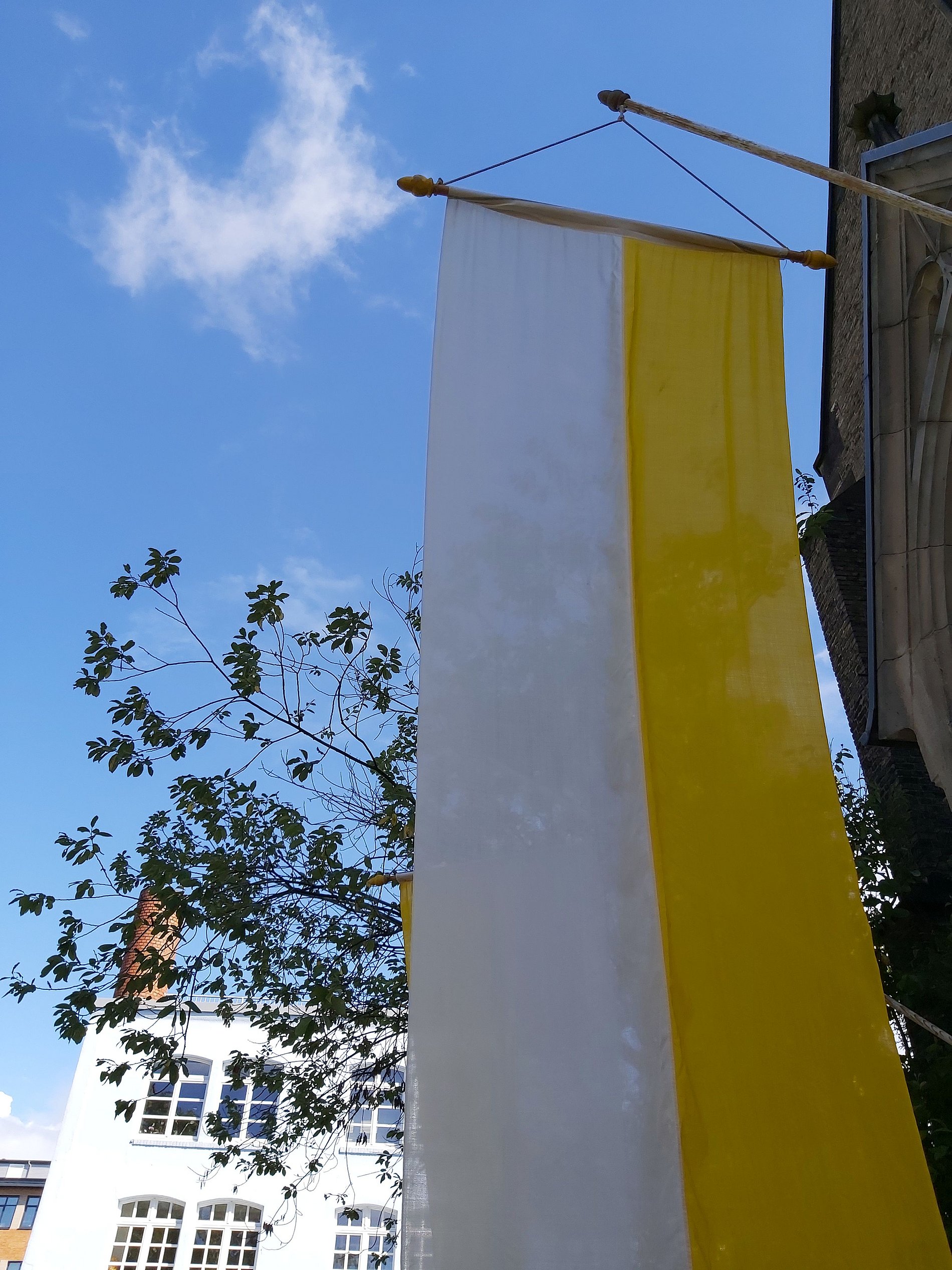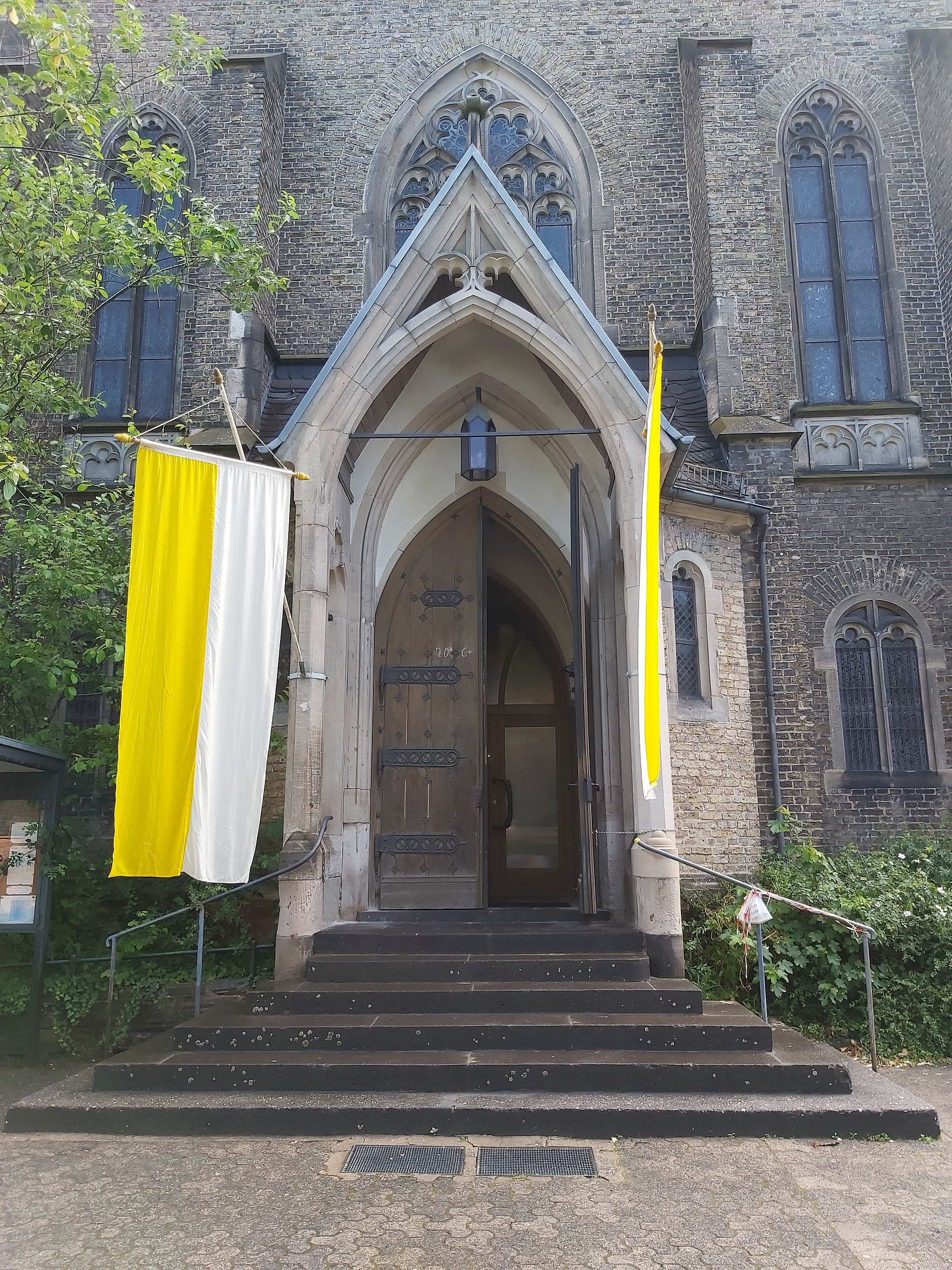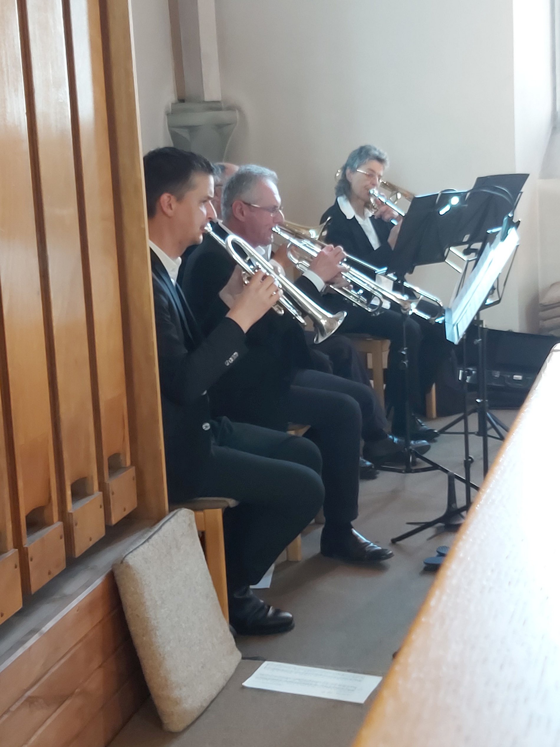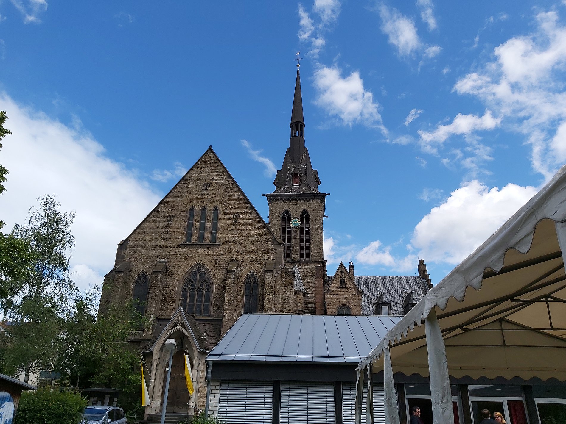 Die beiden Kirchorte Heilig Geist Riederwald und Herz Jesu Fechenheim haben gemeinsam gefeiert. Eigentlich sollte die Messe im Kirchgarten der Melanchtongemeinde in der Pfortenstraße 4 starten. Stattdessen wurde der gesamte Festgottesdienst in die Herz Jesu-Kirche verlegt. Zwar wurde lange überlegt, ob man nicht doch draußen feiern könne, aber dann ließ man die Prozession ausfallen und ging in die trockene Kirche. Die Bläsergruppe wechselte sich in der Kirche mit der Orgel ab, was den Gemeindegesang wunderbar begleitete.