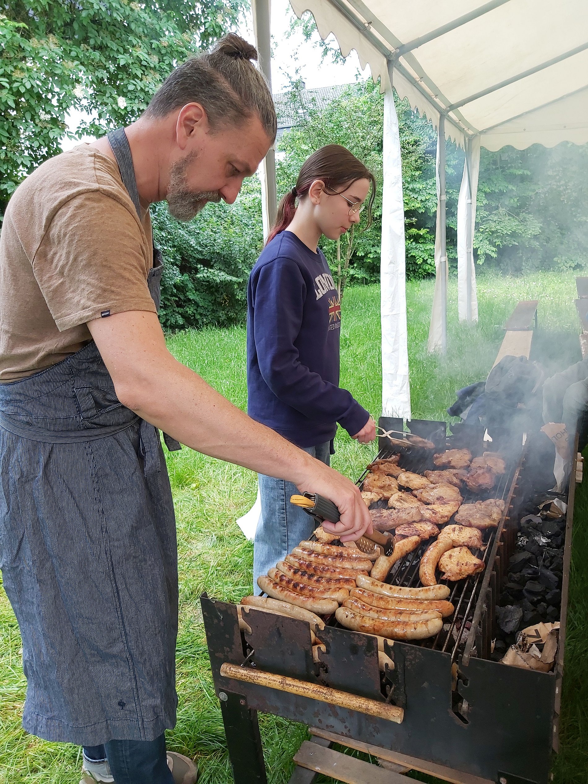 Anschließend waren alle herzlich zum großen Gemeindefest im Gemeindezentrum und Garten eingeladen und sie kamen. Steaks, Würstchen, Schafskäse und Salate schmeckten allen, auch das erste Biergarten-Bier war schon zu haben. Da die Zelte schon aufgebaut waren, saßen alle im Trocknen und nutzten den Nachmittag zu ausführlichen Gesprächen. Leider konnte wegen der Nässe die Hüpfburg für die Kinder nicht aufgebaut werden, aber die nutzten die anderen angebotenen Spiele ausgiebig und hatten ihren Spaß dabei. Glücklicherweise ließ sich die Sonne immer mal wieder blicken.