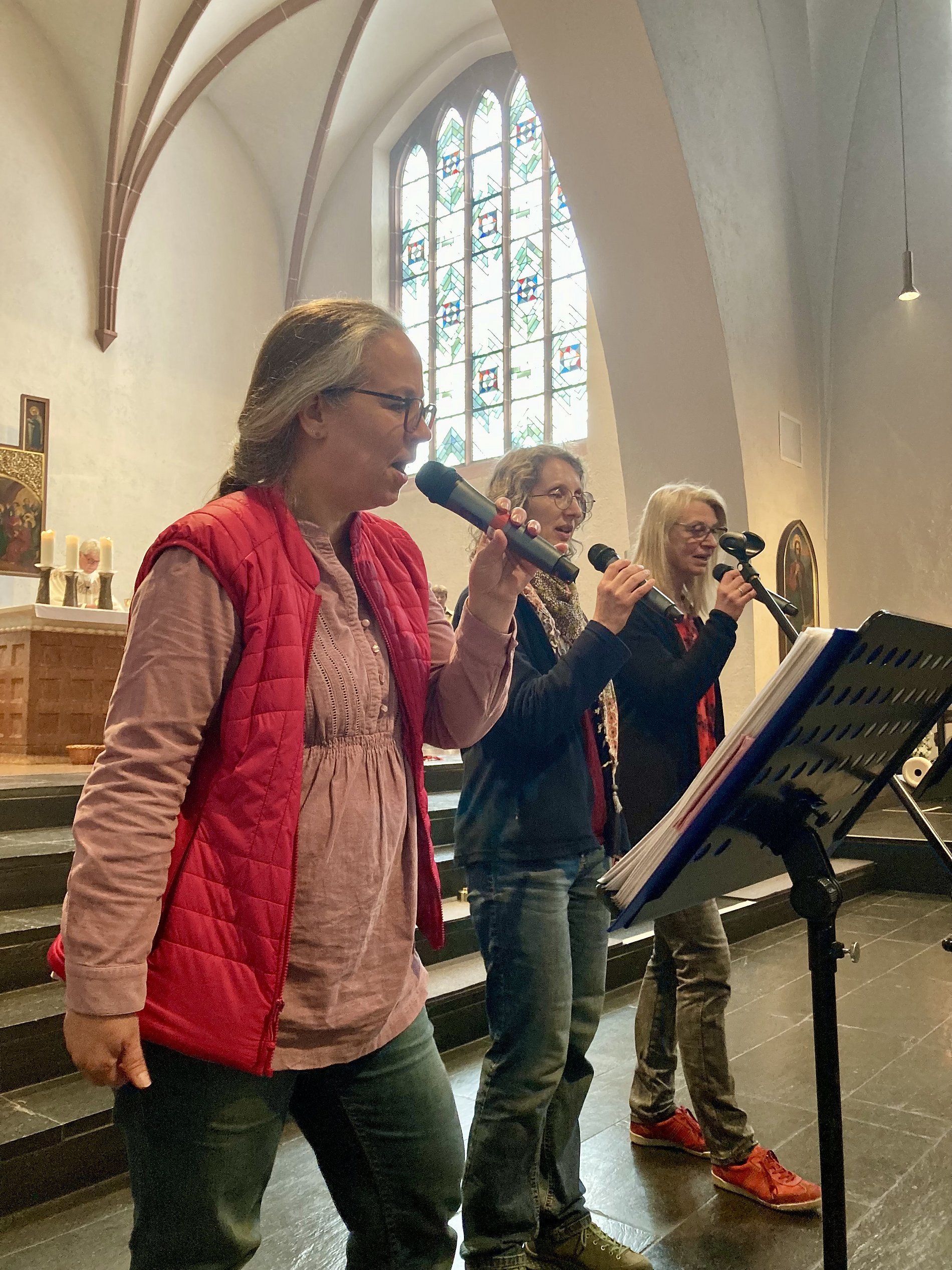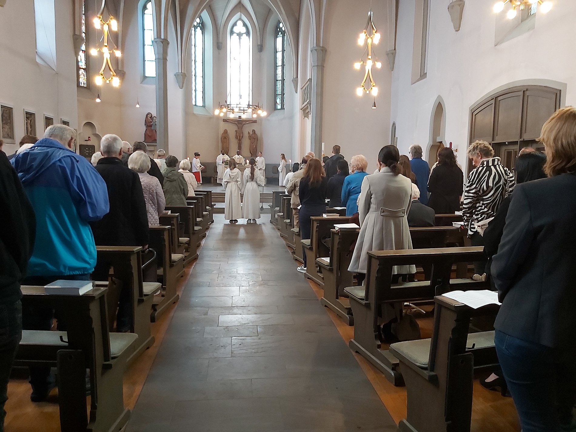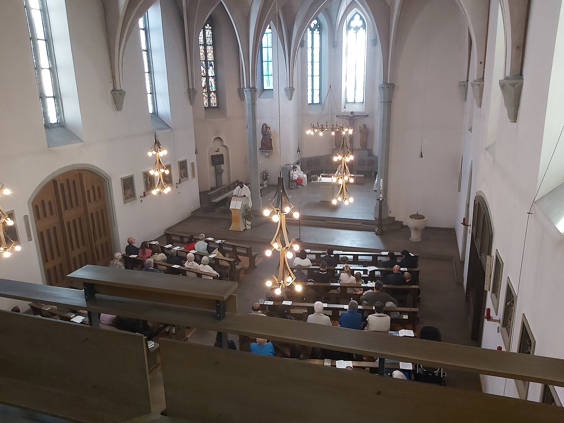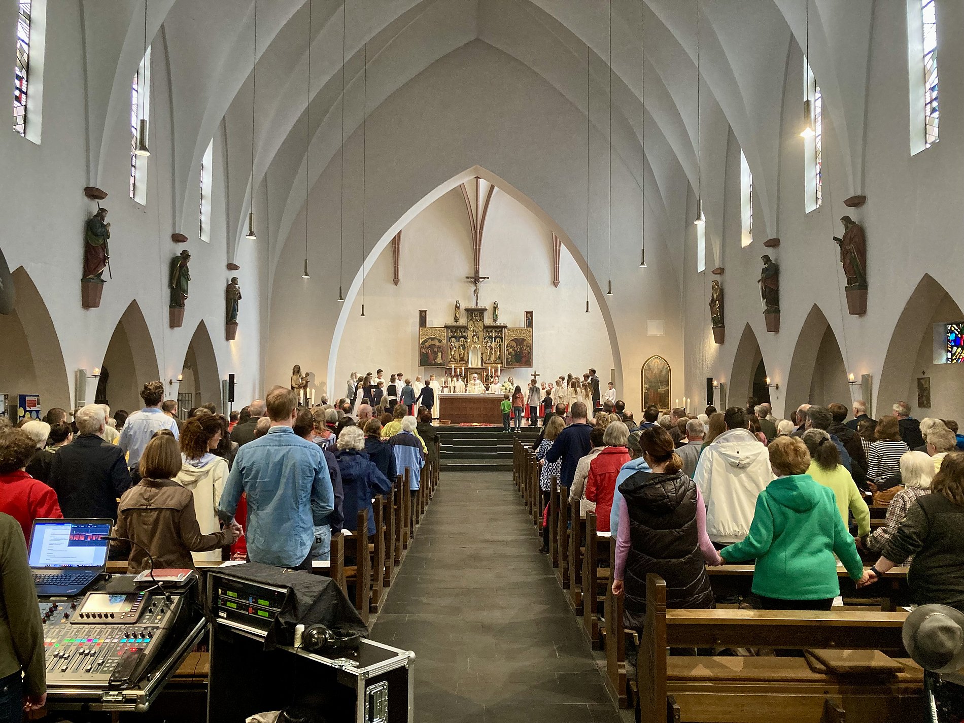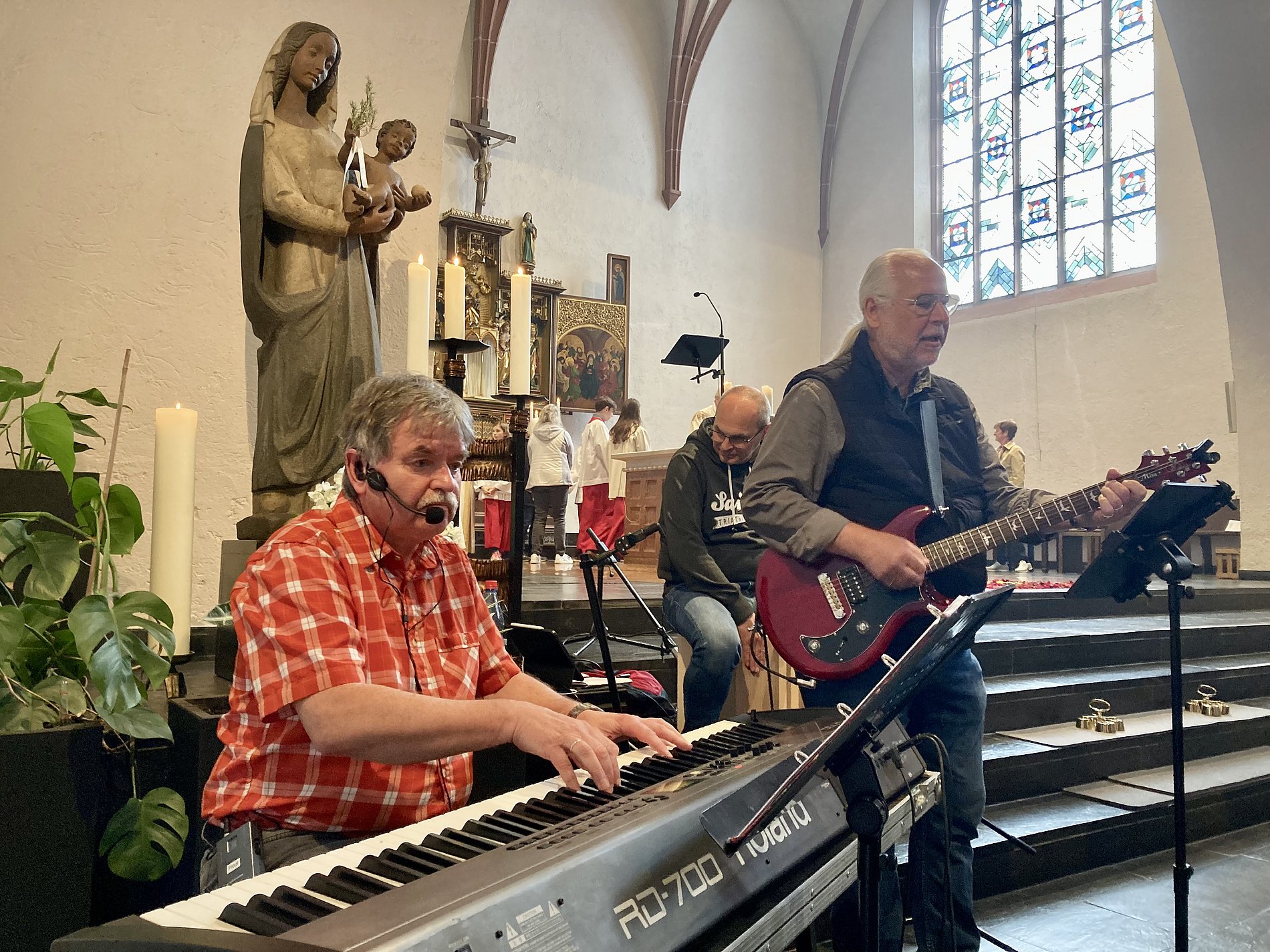 Daher ist der Gottesdienst in die Josefskirche ausgewichen. Die Gemeindeband Effata hat ihre Instrumente im Chorraum aufgestellt, von wo aus sie die Messe musikalisch begleitet haben.